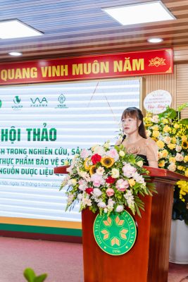 Phát biểu khai mạc hội thảo, TS. Phí Thị Cẩm Miện – Chủ tịch VNUA Pharma, PGĐ Viện nghiên cứu tảo và Dược Mỹ Phẩm đã nhấn mạnh sứ mệnh, tầm nhìn, giá trị cốt lõi, chiến lược của VNUA Pharma và Học viện nông nghiệp Việt Nam cho biết: Ứng dụng công nghệ sinh học trong đổi mới nghiên cứu khoa học và đưa các kết quả nghiên cứu vào thực tiễn đã và đang là vấn đề mà Đảng, nhà nước quan tâm hàng đầu hiện nay. Chúng tôi là các nhà khoa học trẻ đang trên hành trình nỗ lực kết nối giữa 4 nhà “nhà nông – nhà khoa học – nhà máy – nhà phát triển thị trường” nhằm khai thác tối đa các nguồn dược liệu bản địa, hỗ trợ người nông dân sản xuất định hướng.