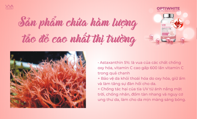 Đặc biệt là thành phần tảo đỏ Haematococcus pluvialis (Astaxanthin 5%) cao hơn gấp 2 lần so với các sản phẩm khác trên thị trường có hàm lượng vitamin C cao gấp 600 lần vitamin C trong quả chanh. Giúp bảo vệ da khỏi bị lão hóa do oxy hóa, giữ ấm và làm tăng sự đàn hồi cho da. Chống tác hại của tia UV từ ánh nắng mặt trời, chống nhăn, đốm tàn nhang và nguy cơ ung thư da, làm cho da mịn màng sáng bóng.