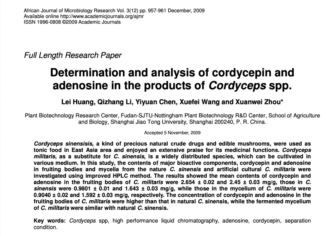 Bên cạnh đó, một số nghiên cứu khác đã chứng minh, các hoạt chất quý trong sợi nấm và quả thể Cordyceps nuôi cấy có hàm lượng cao và hiệu quả dược lý không thua kém so với các sản phẩm Cordyceps tự nhiên (Fan và ctv, 2007).
